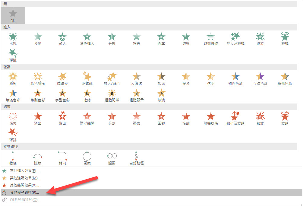 接下來就要幫文字方塊加上動畫效果,我們要做的是由下往上跑,在動畫裡,點擊那個最右下角的其他展開。