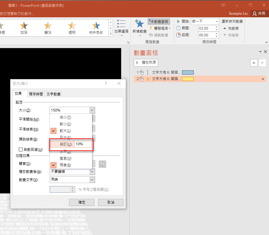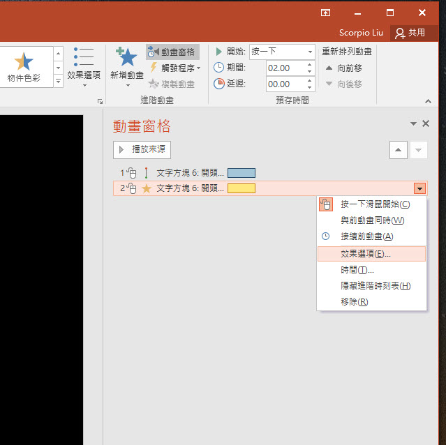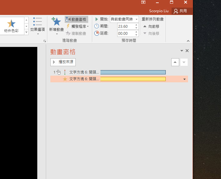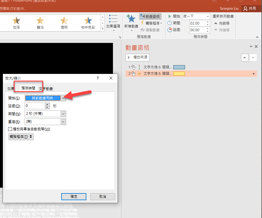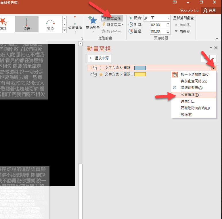 然後點擊進階動畫中的「動畫窗格」,這裡右邊會看到有二個我們前面新增的動畫,一個是路徑由下往上,一個是文字縮放,我們先調整第一個效果選項。
