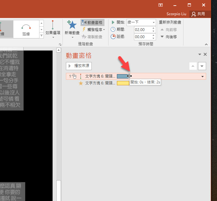 因為預設動畫只有 2 秒非常短,你感受不出差異,我們可以將文字方塊用拉的方式加長時間,建議 15~30 秒應該比較剛好,二個動畫的時間都拉一樣的時間。