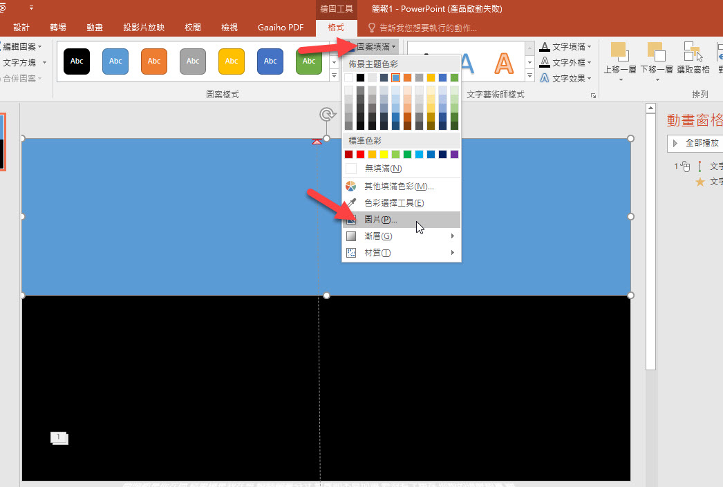 然後再選擇圖案填滿,選擇「圖片」,插入一張全黑的圖片(看你背景色是什麼就插入麼顏色的圖片)。