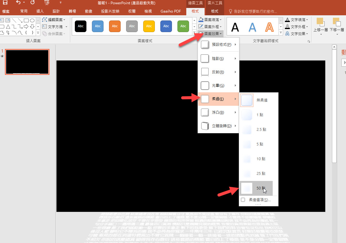 選擇你插入的圖片,選擇圖案效果 > 柔邊 >50 點(如果不夠漸層,就選柔邊選項自訂)。