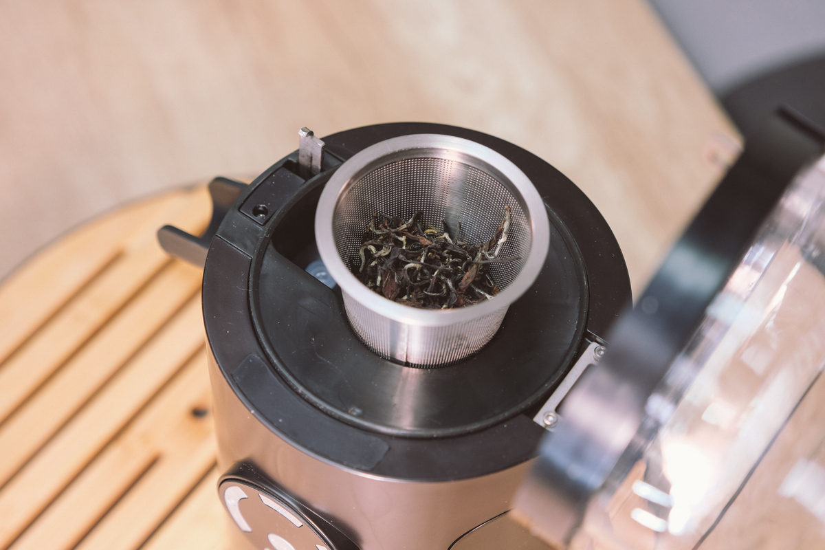 上方的透明蓋打開後,只要利用他們所提供的不鏽鋼網杯加入適量的茶葉後,蓋上就可以設定溫度、時間進行泡茶(或由 APP 操作)。