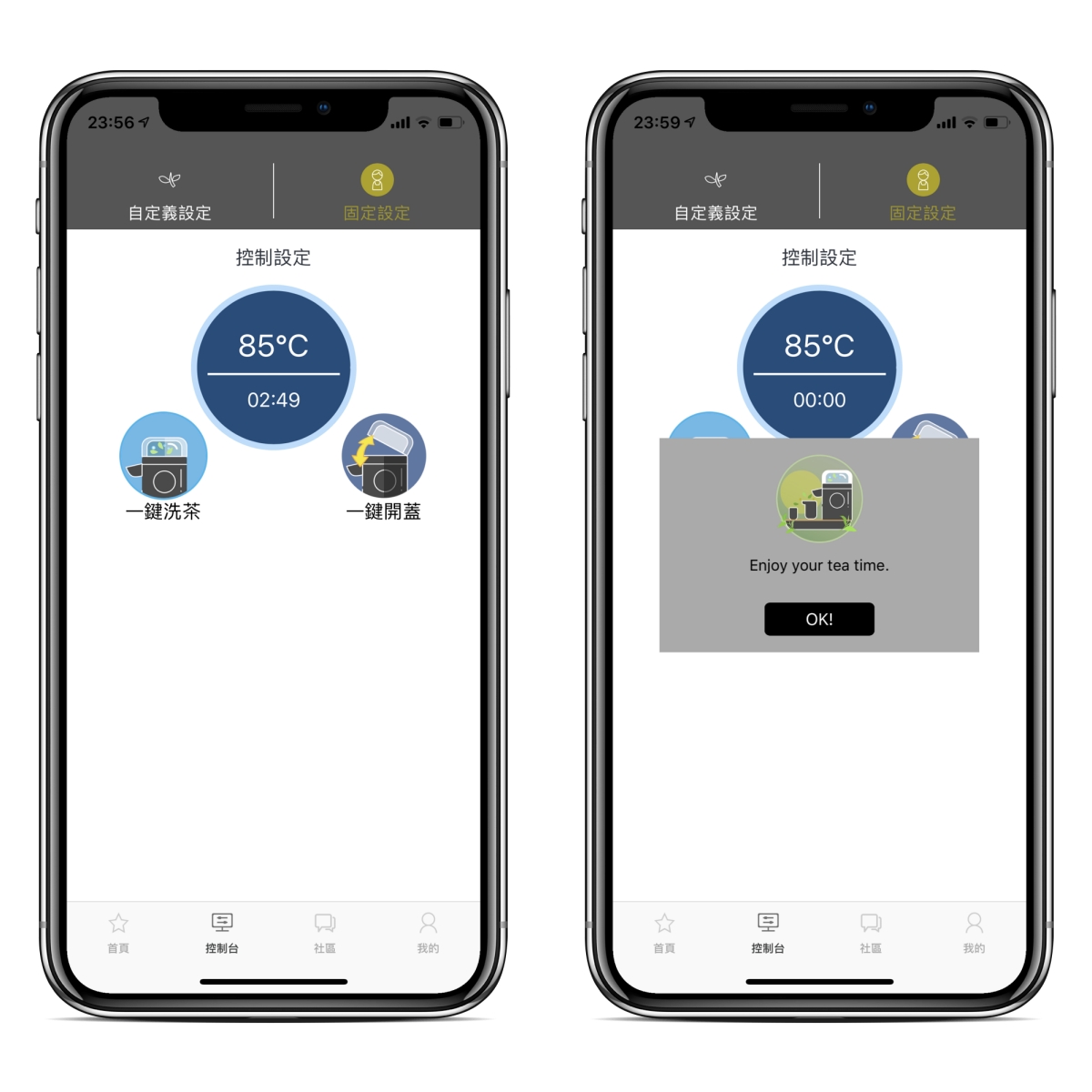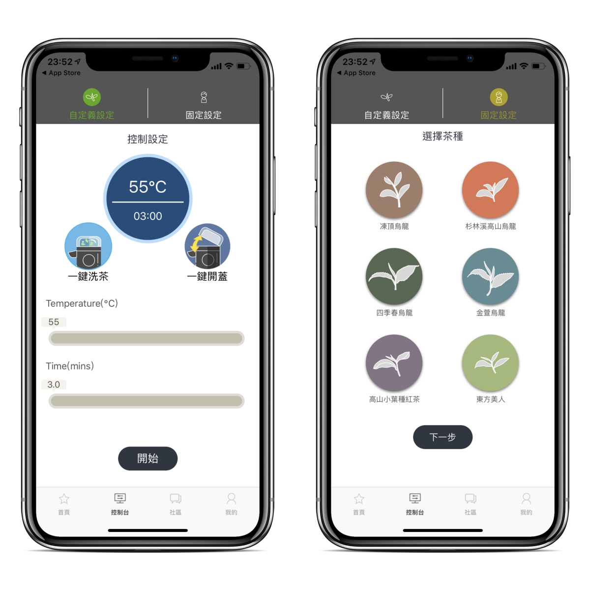 - 一鍵自動泡茶的功能,目前僅能選擇茶種,按下一步就開始泡,但事實上我們在泡茶時,由於茶會愈泡愈淡,所以隨著每一泡我們都會增加時間 5~10 秒,APP 流程應該是選擇茶種 > 選擇第幾泡 > 按開始才泡,也可以加入建議事項在這畫面,比如該茶種建議最多泡幾次,是否建議洗茶之類的。