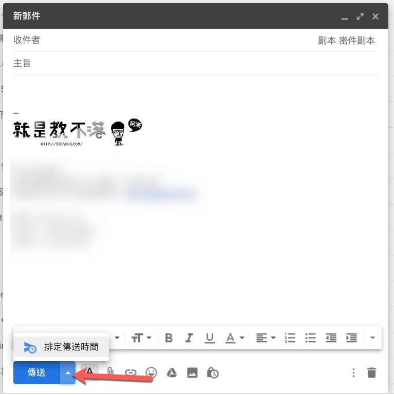 這項功能在手機 APP 及 WEB 網頁版上都已經正式推出,使用方式很簡單,先以網頁版 Gmail 為例,寄件時,在傳送旁點擊展開選單,就會看到「排定傳送時間」可以選擇。