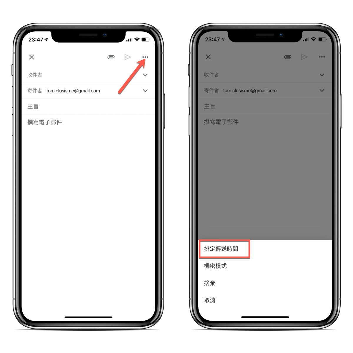 手機的話,不論是 Android 或 iOS 的 Gmail APP,在寄信時,右上角的選單點擊後就會看到排定傳送時間的功能囉。