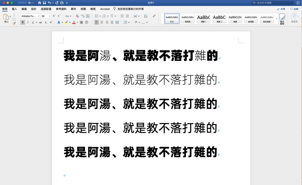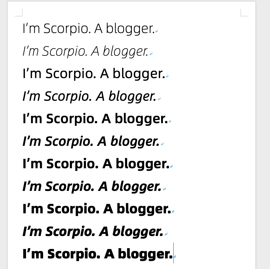 英文部份,其實主要是 6 種字重,其實 5 種只是變成斜體,但字體本身做成斜體其實有些會比你從 Word 裡調整成斜體來的好看。