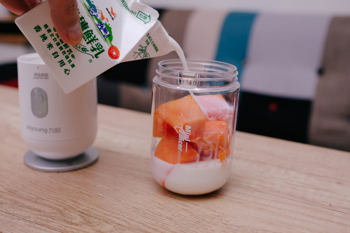 首先來試一下大家很愛的木瓜牛奶,先把一整盒的木瓜直接丟進去,然後加一罐最小罐的瑞穗鮮乳進去。
