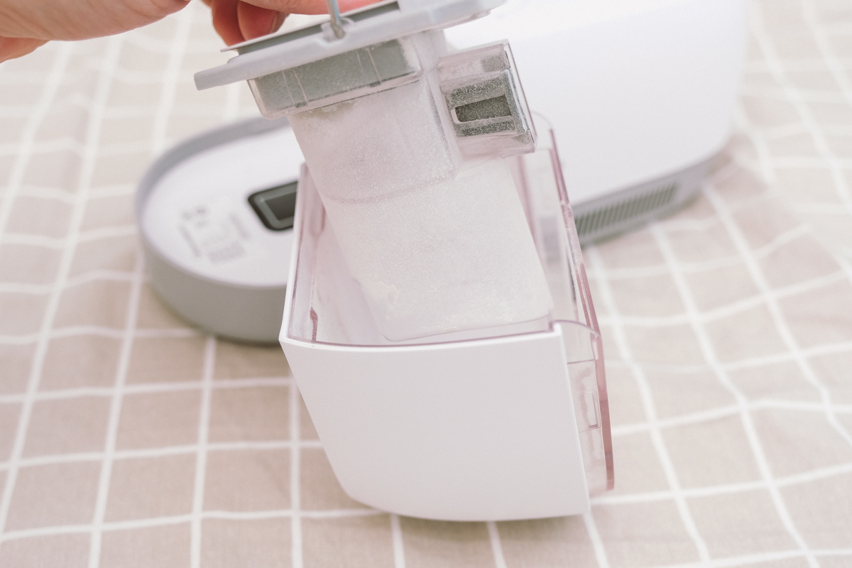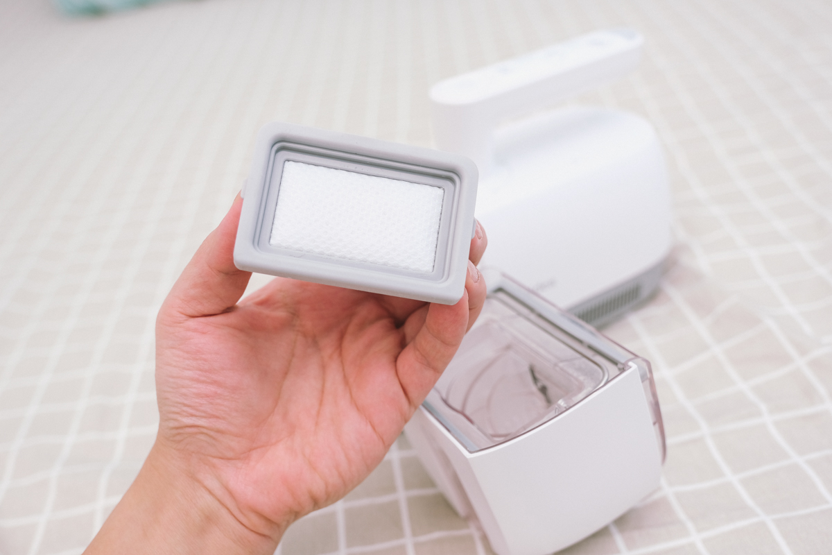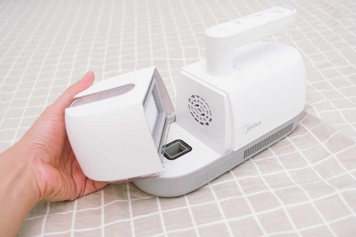 前方的集塵盒 0.35L,認真來說大概吸一個久違的床墊就可以弄滿,但這是除蟎機不是吸塵器,真的不需要大容量的集塵盒。