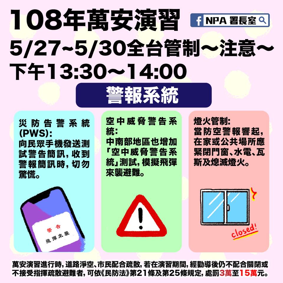 每年例行性的萬安演習將於 5 月 27 日至 5 月 30 日分別於北、中、南及外島地區實施,此次演習也會依災防告警系統(PWS),向民眾發送測試警告簡訊,警政署臉書專頁「NPA署長室」也在臉書粉專發布懶人包,提醒大家萬安演習該注意什麼?如果手機沒有收到警報,又要如何得知演習開始了?又如果正在開車、正在坐車,該如何避難呢?!