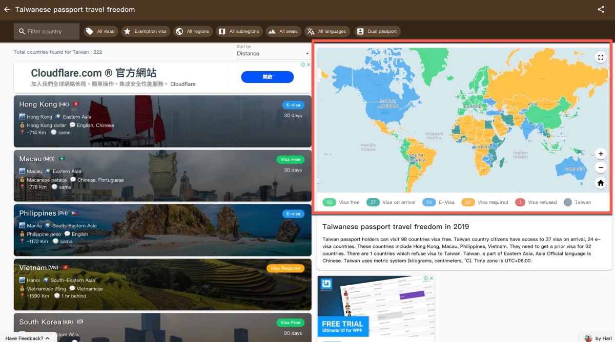 如果你常在亞洲地區旅遊應該比較沒注意,因為持台灣護照在鄰近熱門的旅遊國家日本、韓國是免簽證的,而去大陸跟香港則只要有台胞證也可以,但像是美國或東南亞的泰國、越南等,都是需要簽證的,各別需要的簽證種類也有所不同,當然,如果是透過旅行社代辦,這些都是付錢就解決的,但如果是自由行還要自己注意一下簽證這件事,那麼,要怎麼查看去哪些國家免簽證,哪些需要電子簽證或落地簽,以及有效期限呢?我們可以透過 Visa List 這個網站快速來查詢。