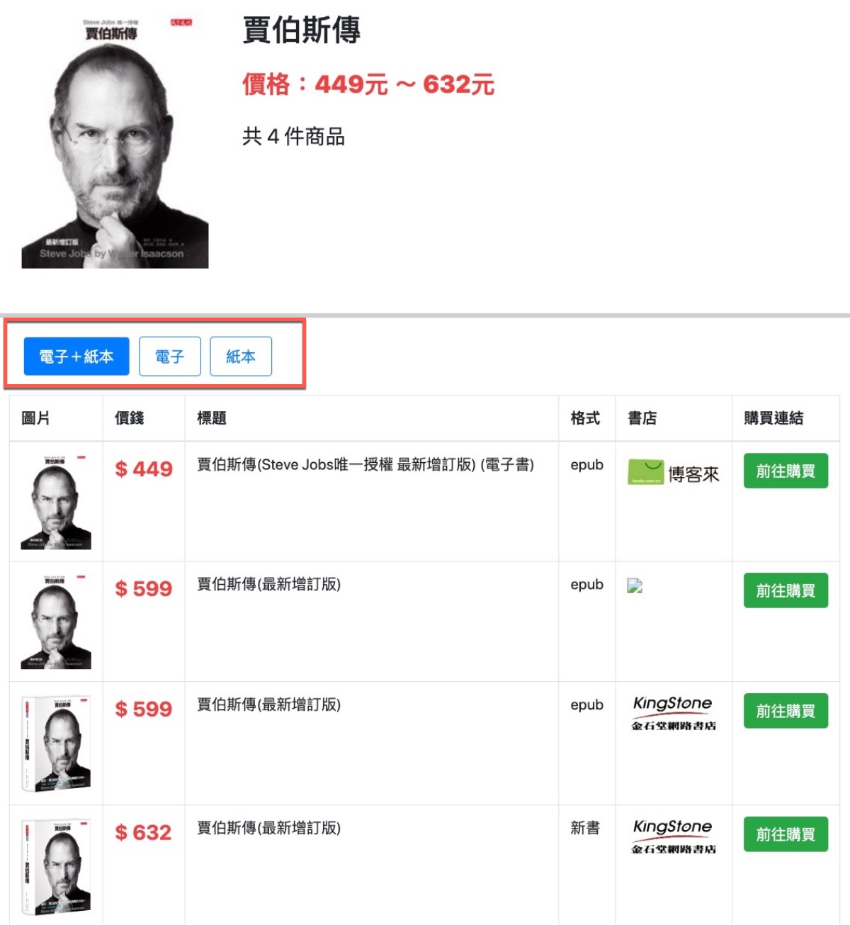 再來搜一下我已經買過的書,分別在博客來、Kobo 樂天以及金石堂都有,但光是電子書的價差居然就有 449 跟 599 的差異,至少差了 150 元,很多啊,我們可以點擊比價所有商品進入查看。