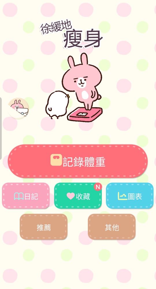 《徐緩地瘦身-體重管理用 App 程式》 的介面實在是太~~療癒了!一開始先輸入個人資料體重和體脂,接著系統就會把我們每天輸入的資料用曲線圖來顯示變化。還可以寫寫減肥日記幫自己記錄下減肥心得,在日記中也能使用許多可愛的卡娜赫拉貼圖來讓日記更活潑,而且隨著體重的增減變化,登場的插圖也會有所不同。