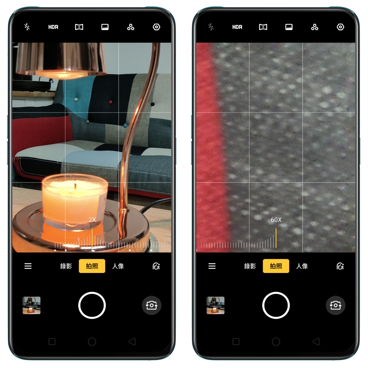 OPPO Reno 10 倍變焦版搭載潛望式結構鏡頭,最高可以達到 10 倍的無損變焦,而數位變焦更是來到了手機史無前例的 60 倍,如果想要調整倍數,除了點擊倍數鍵切換之外,也可以按住倍數鍵左右滑動調整更精準的倍數。