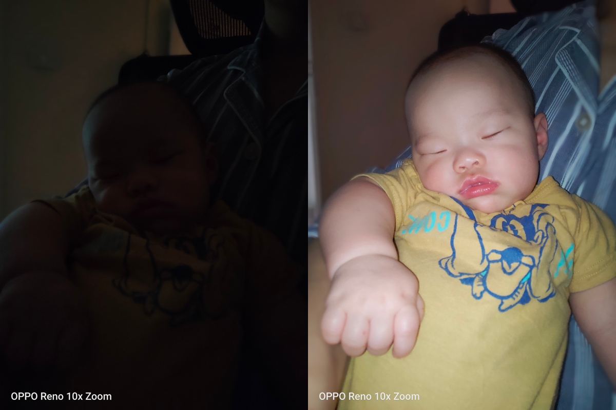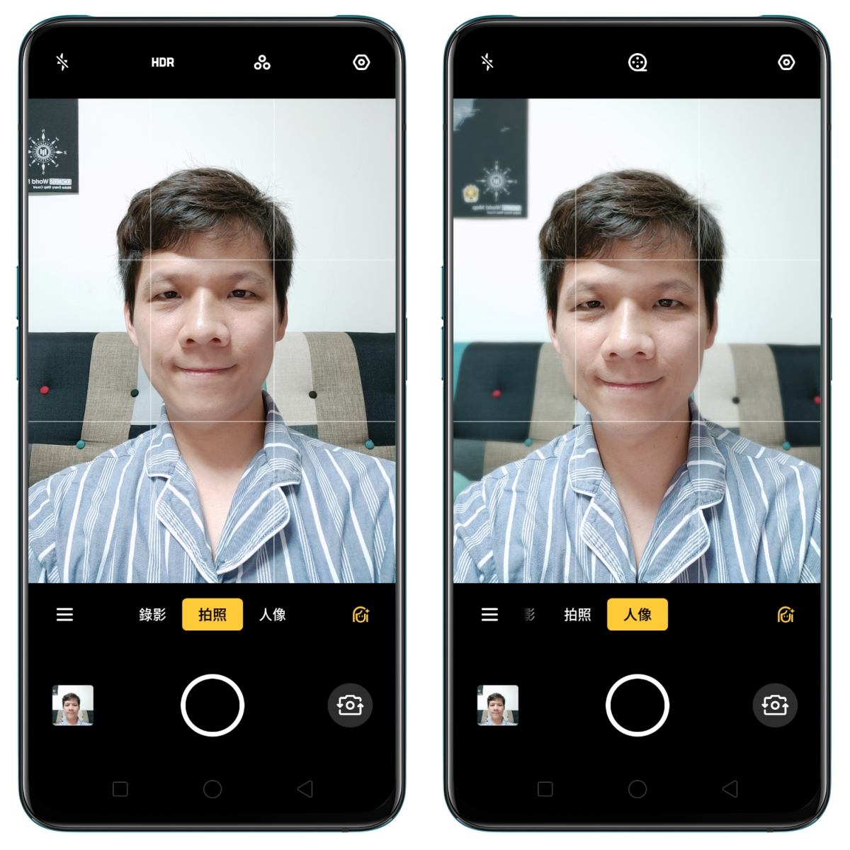 前方之所以稱為「柔光燈」當然是有其原因的,左邊照片是在暗房中沒有開啟柔光然自拍,可以看到房間真的很暗,以往前置鏡頭補光,普遍要柔和一點就是使用螢幕補光,不過螢幕補光有個小缺點是,距離稍遠一點的話就會變的很暗,相對畫質也會變差,而 OPPO Reno 則是搭配專用的柔光燈,補光後(右圖)的效果非常的柔和,不會有強光的邊緣感,且光感很均勻。
