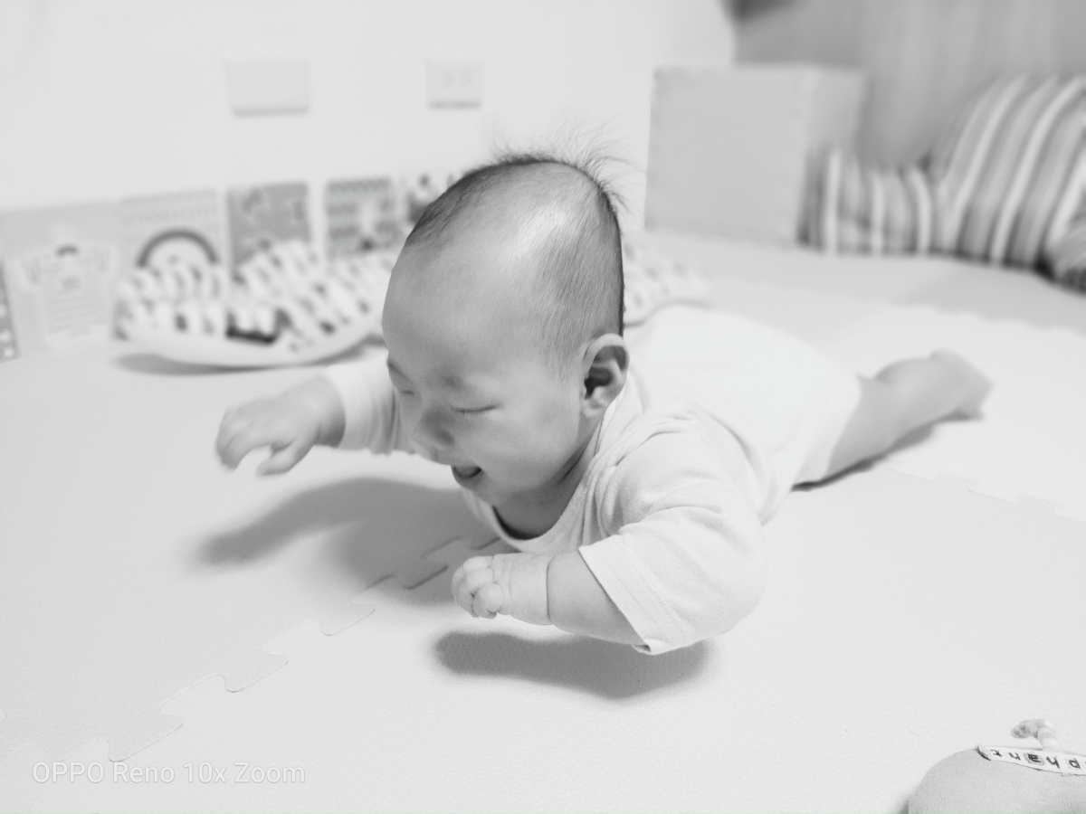 善用濾鏡也能拍攝出更多有味道的作品,像我兒湯包在那自己玩耍,我用了內建的黑白濾鏡來拍攝,還很湊巧的拍攝到他雙手剛好停留在空中,很像是飛起來的感覺,而「黑白」的照片給人原本就是一種「時間靜止」的感覺,透過這樣的演譯,似乎也能更加還原照片當下的感受。