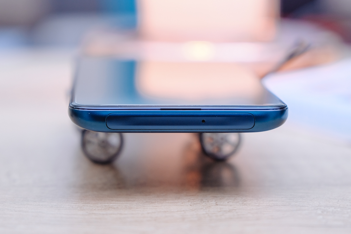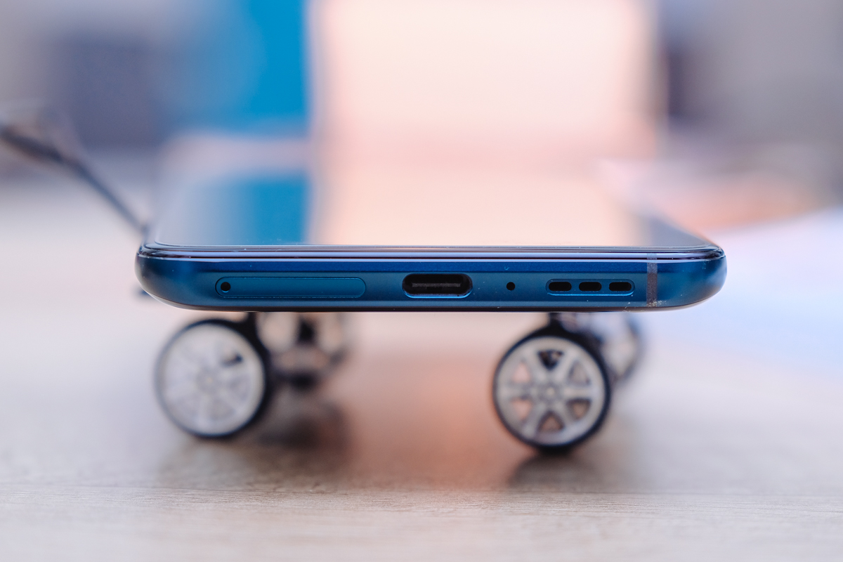 底部為 SIM 卡槽、USB-C 充電連接埠、降噪麥克風以及支援杜比全景聲環繞音效的雙揚聲器。