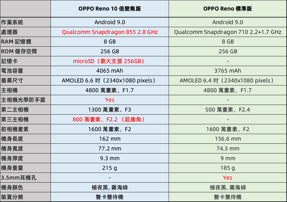 相信大家都會好奇新上市的 OPPO Reno 10 倍變焦版跟上個月上市的標準版有什麼差異,不用再去找資料了,阿湯幫大家整理好了,主要差異也已經幫大家標好紅字,主要就是處理器、記憶卡擴充以及鏡頭的部份(10 倍變焦版有潛望式結構鏡頭、超廣角鏡),另外就是 3.5mm 耳麥孔,其他差異較不大的沒標紅字,直接參考下表應該就一目瞭然了。