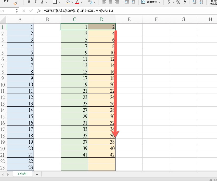 先給大家看一下,這就是有人問我的,假設原本在 A 欄資料是 1、2、3、4、5、6 .... 然後,要將這一欄資料拆分到 C 跟 D 欄位中,應該看圖就懂我們要做什麼,目前該網友是使用手動複製貼上的方法,但如果有一千筆的話真的會死人吧,往下來看怎麼做。