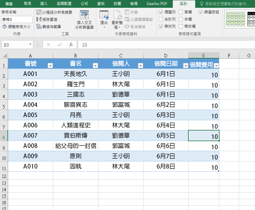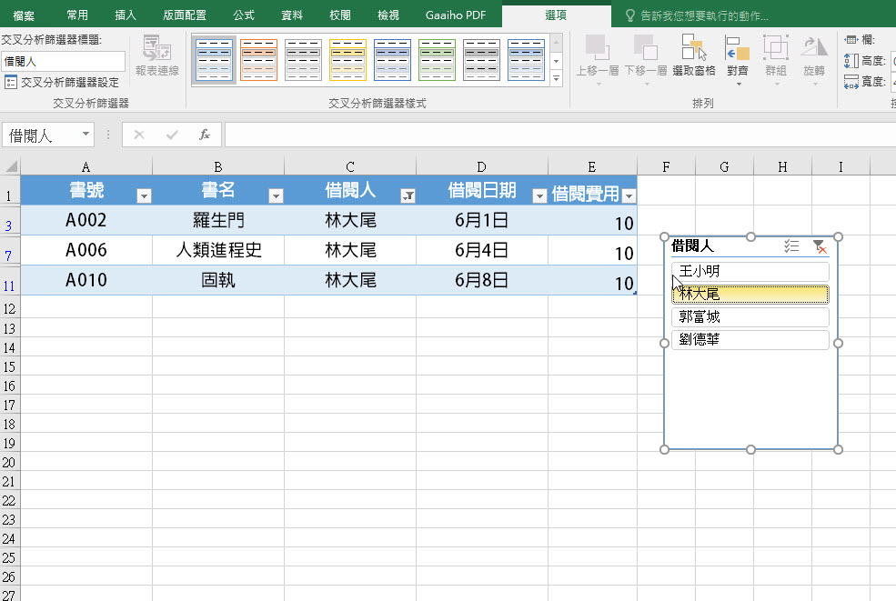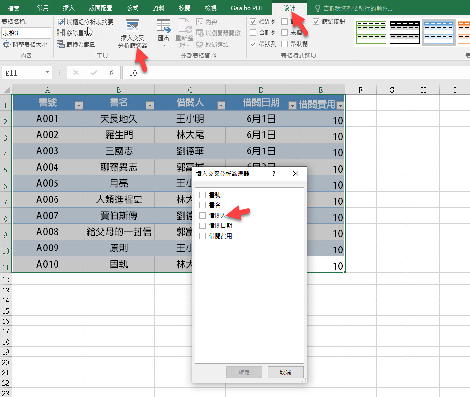 那麼 Ctrl + T 除了美化之外,這美化完後我們可以做更多事,比如,同樣點選表格欄位任一個後,在上方設計裡,找到「插入交叉分析篩選器」,然後選擇一個你最常需要篩選的標題,比如我是勾選借閱人(可以多個)。