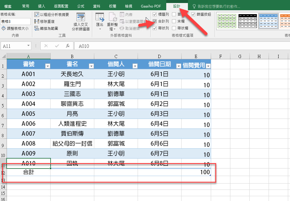 小技巧三:同樣選擇表格任一欄位後,在設計裡,將「合計列」勾選起來,就會看到表格的最下方出現合計欄位,不過這不只是可以做加總。