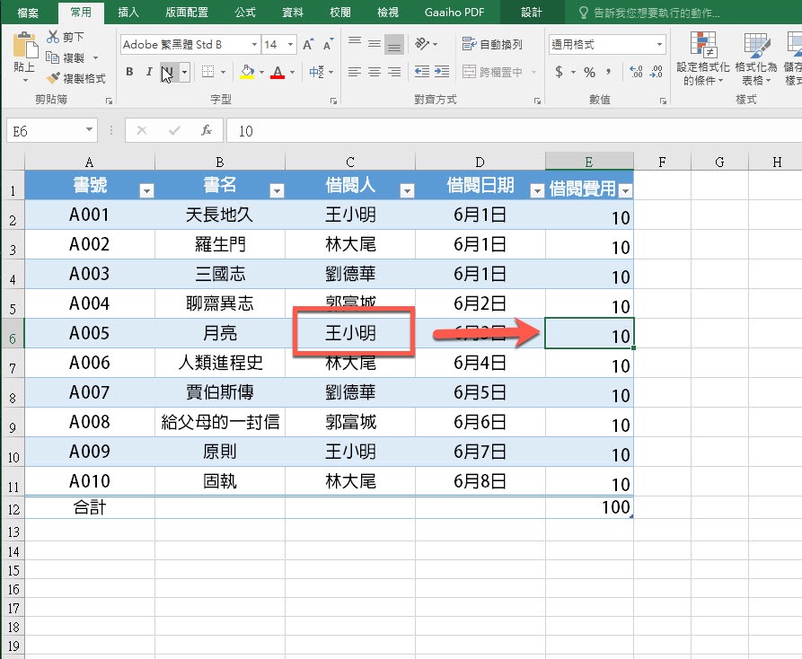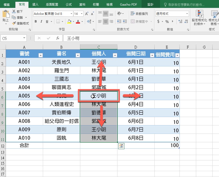 用來快速跳至該列或行的最前/最後面,比如選擇王小明後,按下 CTRL + 方向鍵右,就會跳到最右邊的欄位。