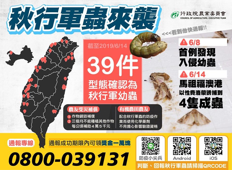 自從秋行軍蟲在苗栗發現首例後,目前確認為秋行軍蟲的通報全國案件更是已經有 52 件,並且在馬祖出現了 4 隻成蟲的危機,現在為了避免秋行軍蟲災情擴散到全台灣,行政院農委會正式發布懸賞消息,只要民眾在 6/21 前發現秋行軍蟲後主動通報,並且確認為秋行軍蟲就能獲得 1 萬元獎金!那麼要如何通報?又要如何辨識秋行軍蟲?行政院農委會也提供了四種通報方式!