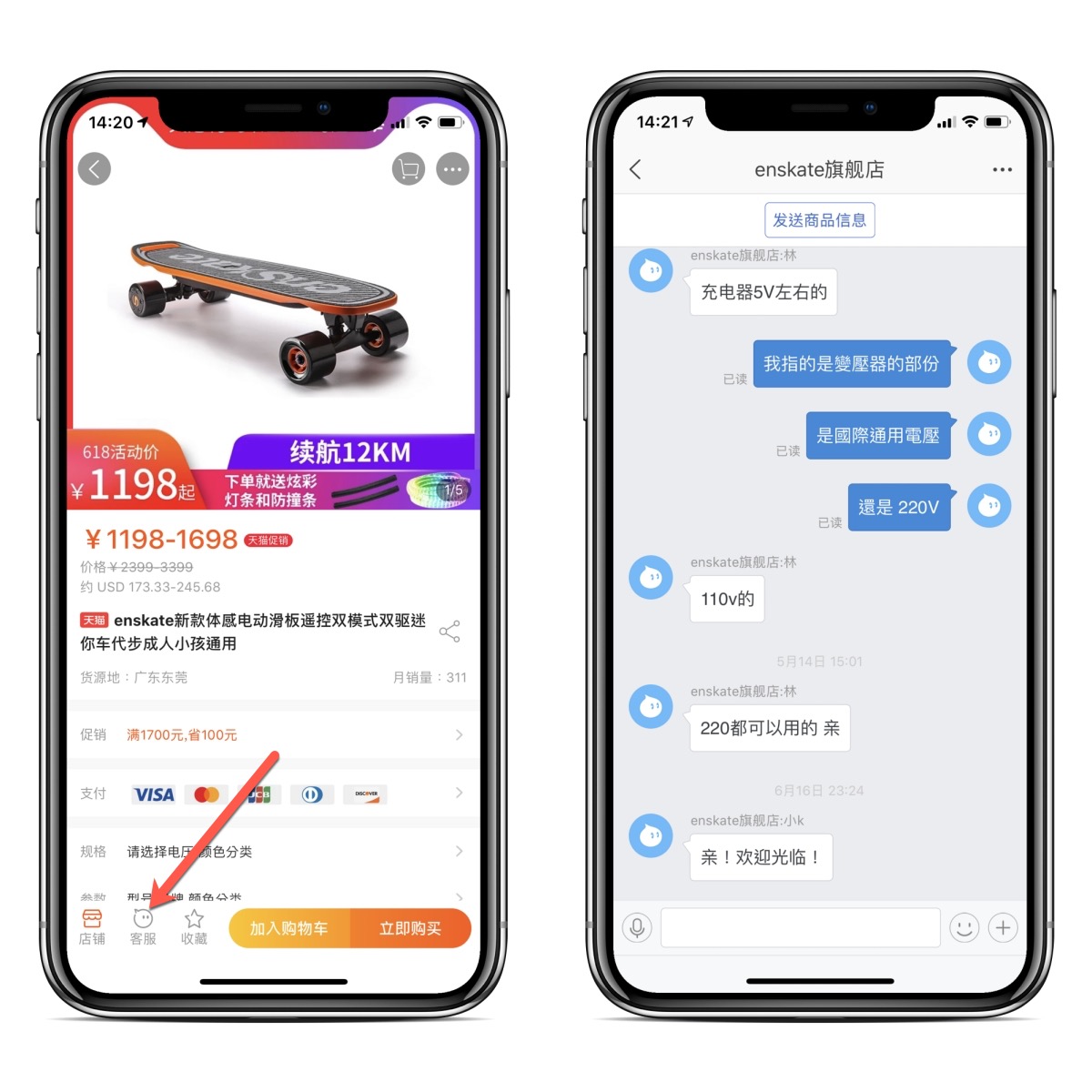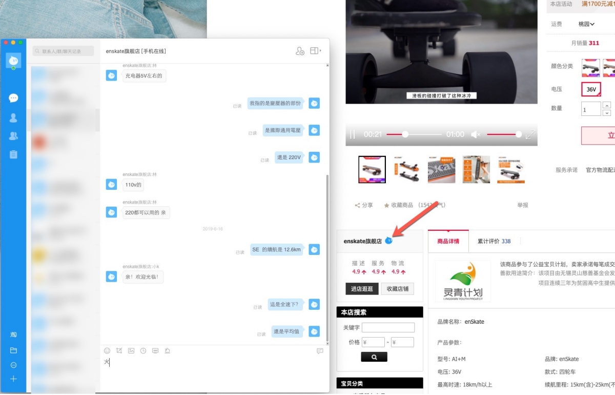不論你要買什麼東西,如果是電器類的,建議一定要先透過阿里旺旺詢問一下店家做雙重確認,因為我有遇過網頁上寫 100-240V,結果東西是 220V 的狀況,每個商品頁面左邊一定都會有一個藍色小頭圖示,點擊後開啟阿里旺旺後,就可以直接和店家對談,一般淘寶店家個人較多,但回覆通常很快,而且到了半夜還在回覆的也有一堆,很強大,都不用睡的。