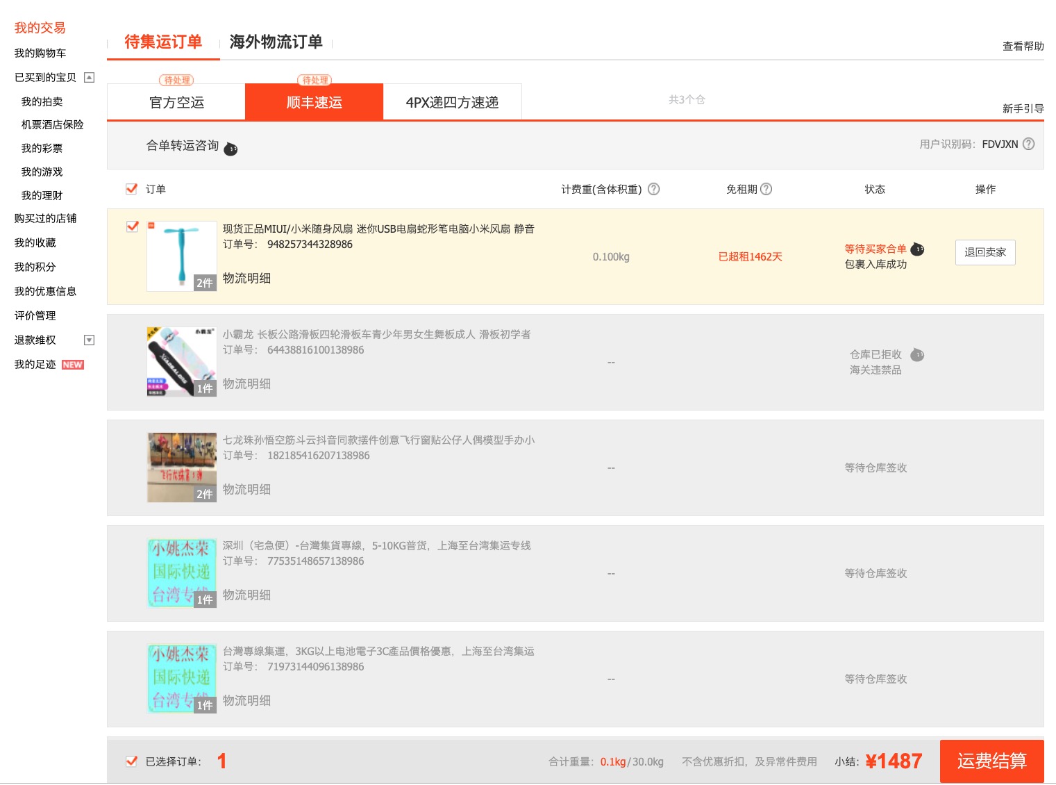 如果是選擇官方集運的話,當你物品寄達集運倉後,在你的後台裡,「己買到的寶貝 > 官方集運」裡就會看到,然後就可以勾選你要集運回來的商品後進行結帳,這次結帳的就是運費,地址就要填對。