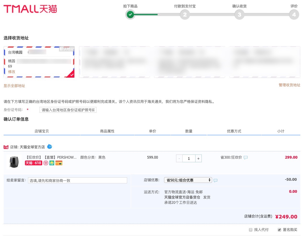 在下單的時候,將寄件資料填寫我們上一個步驟取得的資訊,然後就送出吧,淘寶上買的東西普遍都有包運費,所以國內這一段幾乎不會有額外費用產生。