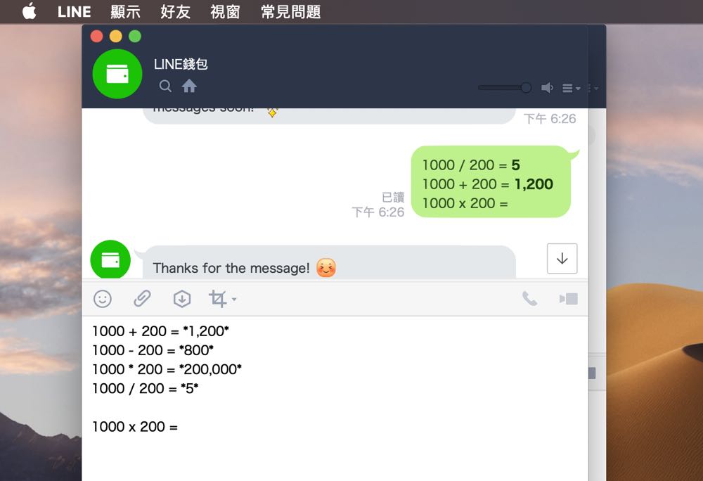 更新完畢任意開啟一個對話視窗,輸入任何你想要挑戰或是真的要算錢、分攤錢、收錢的算式,最後打上"=" ,接著後面就會直接出現一組 *__* 的答案!