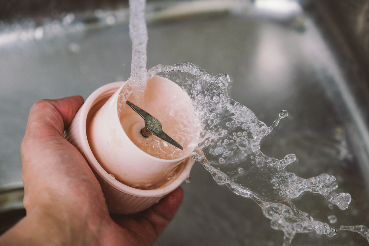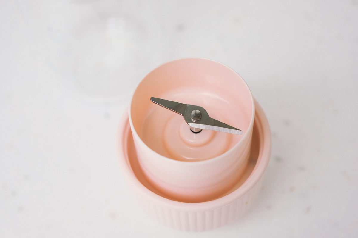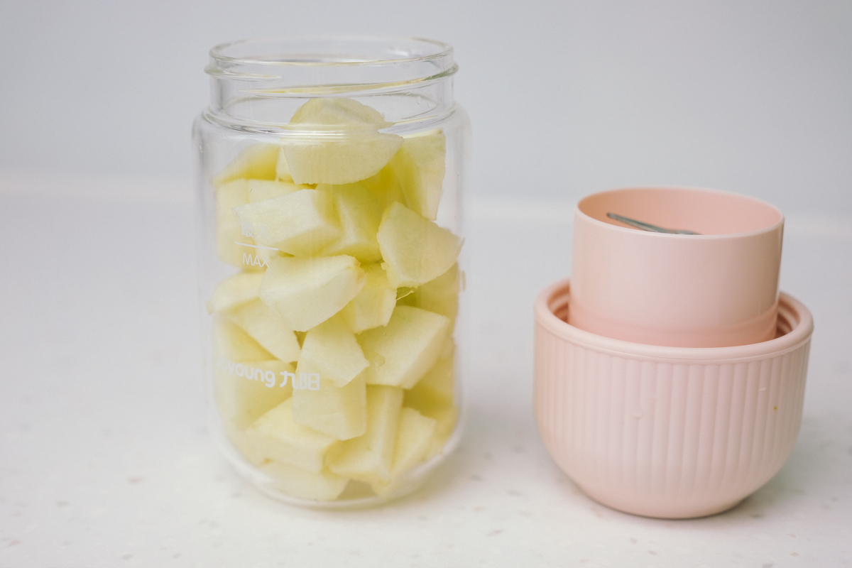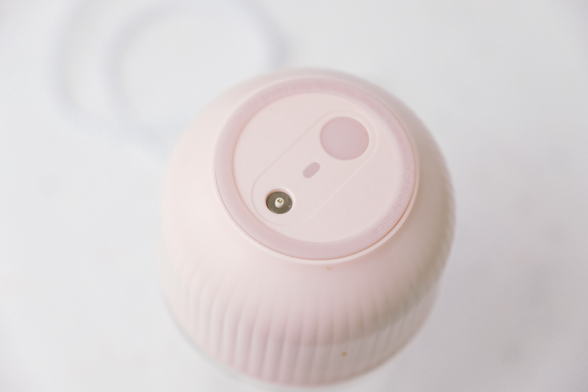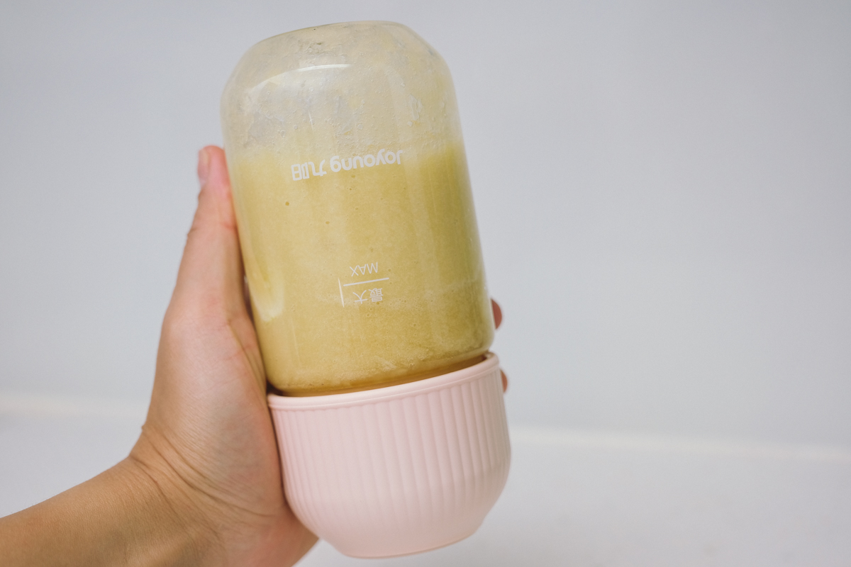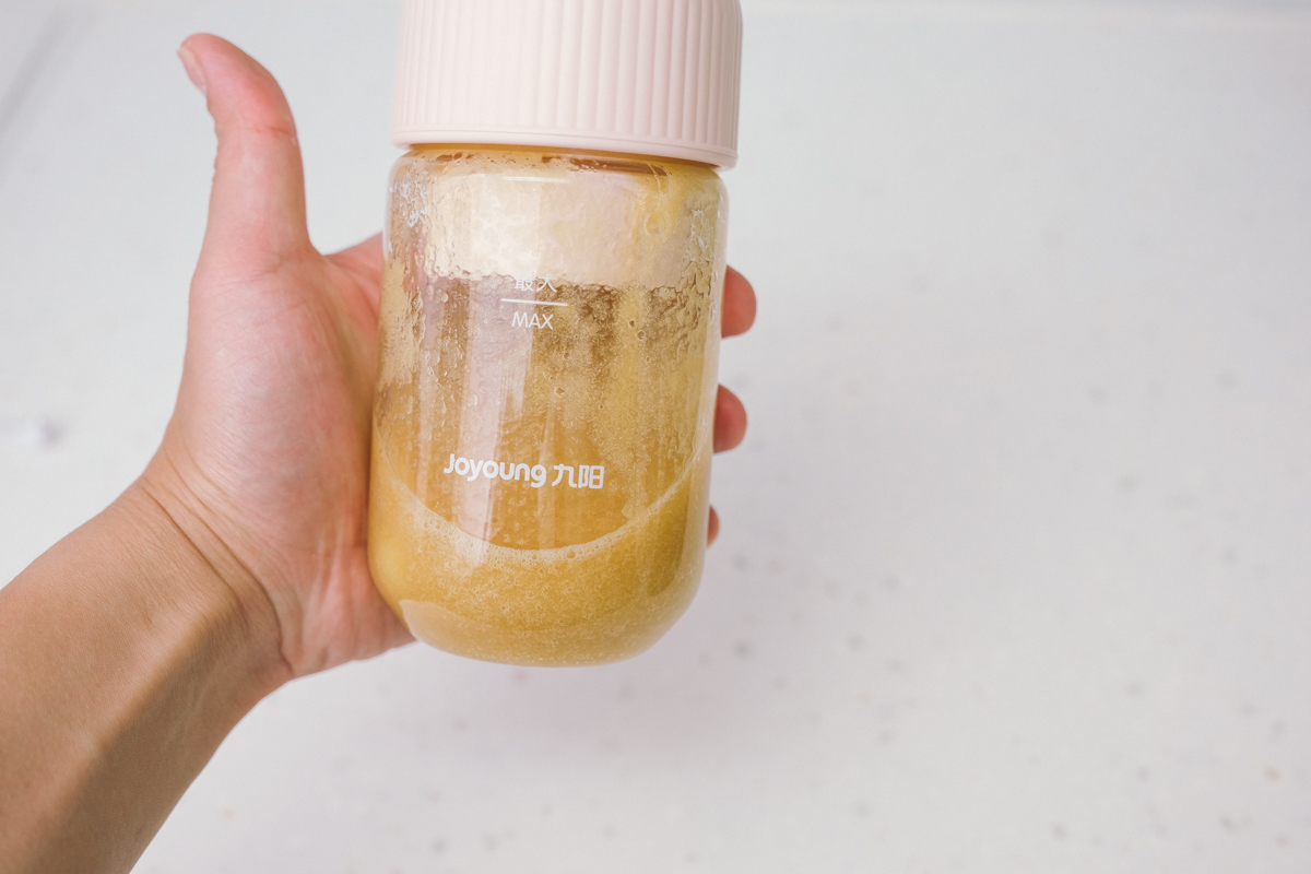打果汁很簡單,上方開關鍵按二下就會開始打,你再倒過來就可以了,在打的過程你也可以搖晃增加均勻度,或者傾斜不同角度來讓水果更好打進去。