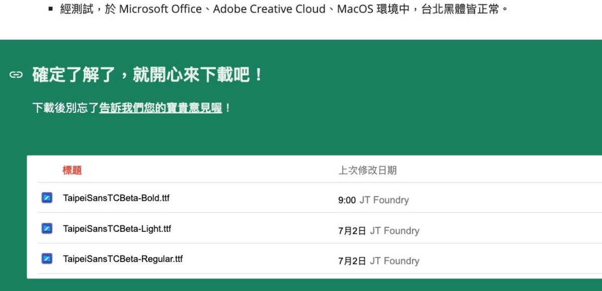 在下載頁面中會有三種字重可以下載,大家可以都安裝,目前台北黑體也已經在 Office、Adobe 及 macOS 中測試過,安裝我就不多介紹了。