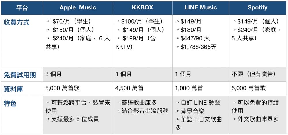 學生而言,Apple Music 和 KKBOX 都有針對學生推出每個月 $70 和 $100 的優惠價; 若是想要一個帳號全家都能用的方式來看,Apple Music 和 Spotify 也有推出 “全家餐” 概念的