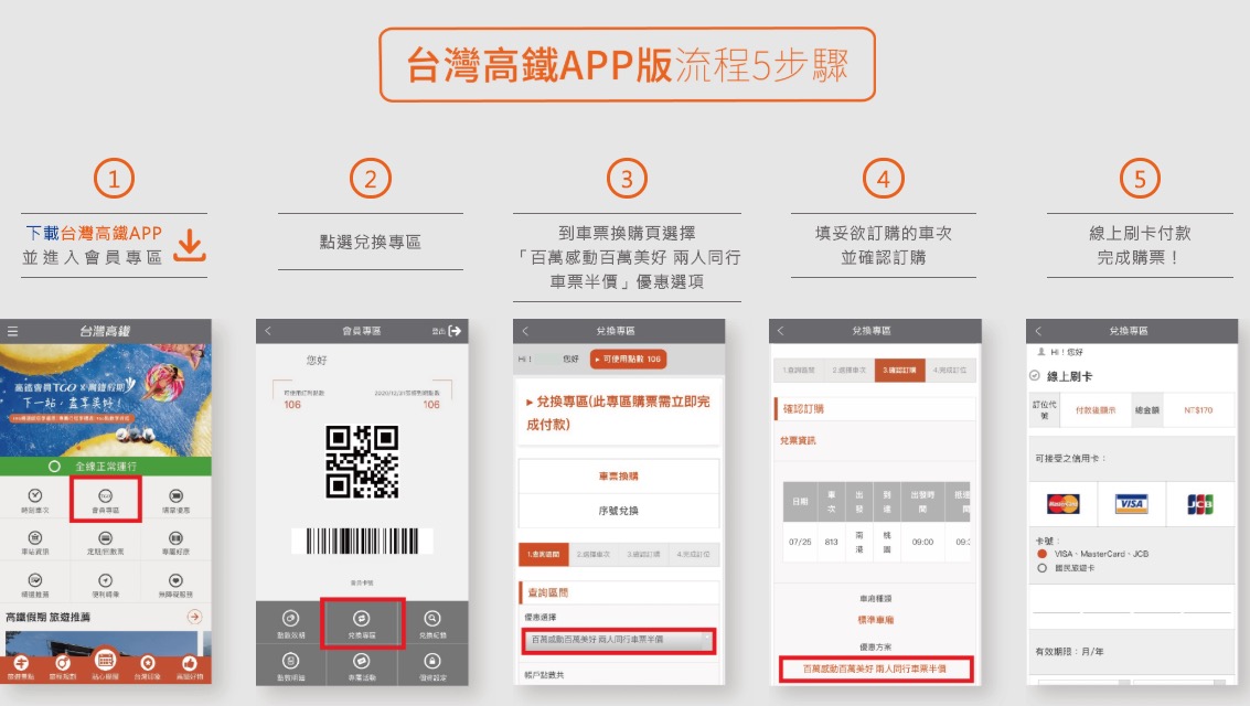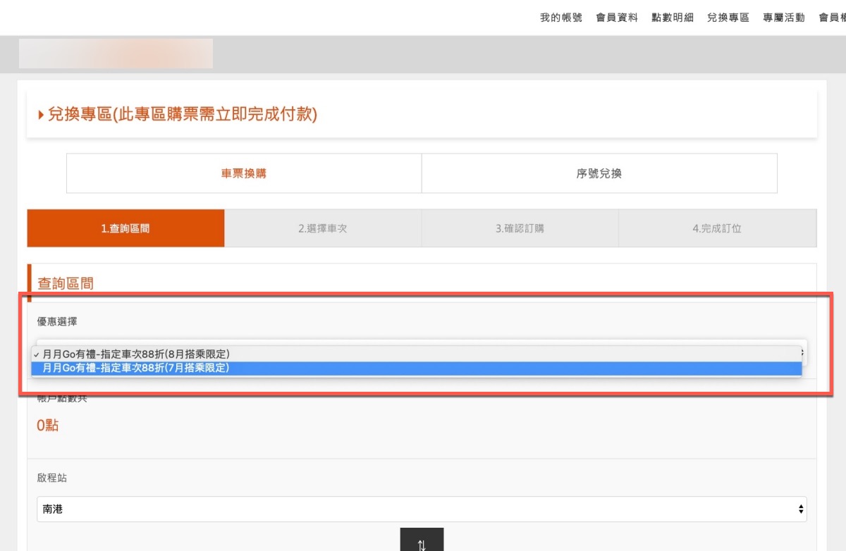 註冊好 TGo 會員後,時間到了你要搶票可以選擇用電腦或是手機 APP,以電腦來說,登入 TGo 會員網站後,在右上角會有個「兌換專區」,然後在優惠選擇那,時間到的話會出現「百萬感動百萬美好 兩人同行車票半價」選擇後再選擇要購買的車次時間,並進行結帳就可以了。