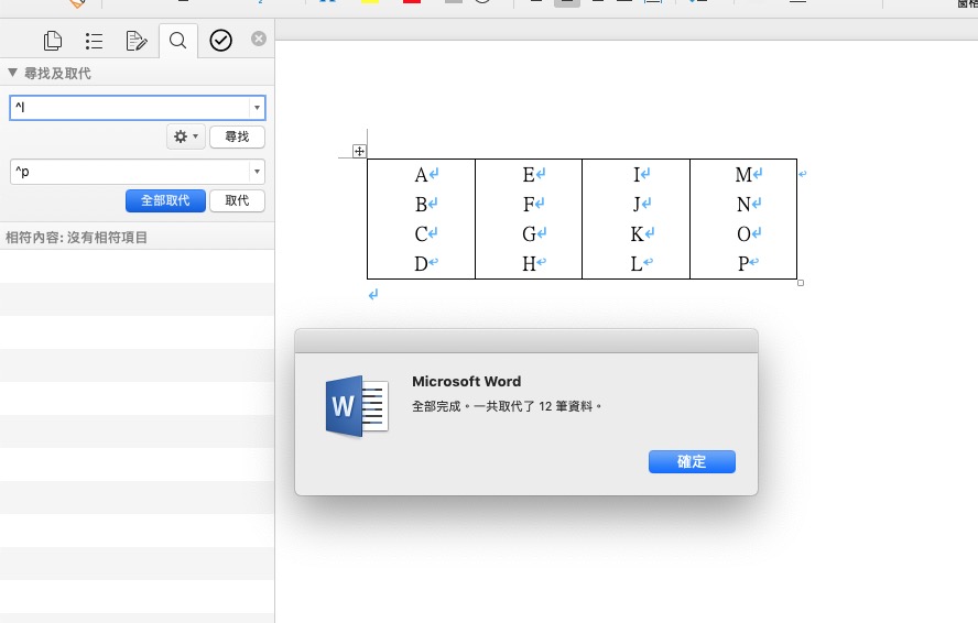 接下來按下組合鍵 Ctrl + H,打開尋找及取代功能,要尋找的值請輸入「^l」,取代的值輸入「^p」,按下全部取代。