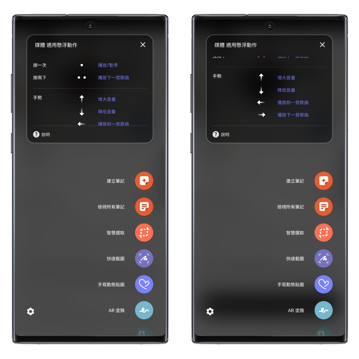 另外在播放音樂或影片時,也可以利用 S Pen 的遠端遙控操作,功能如下: