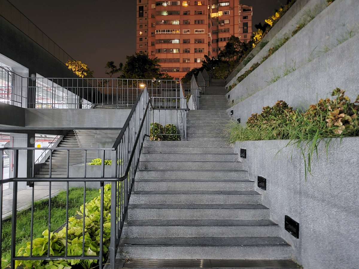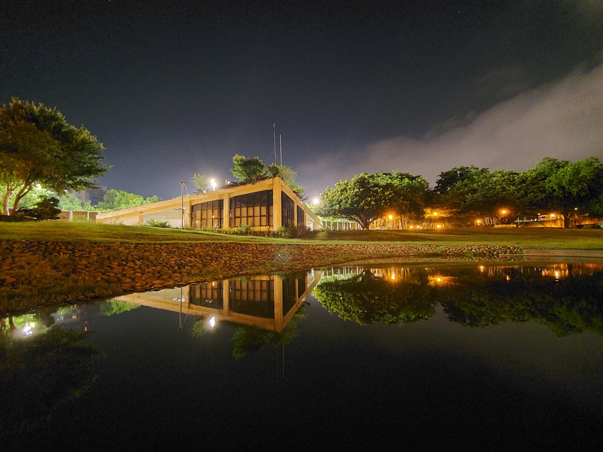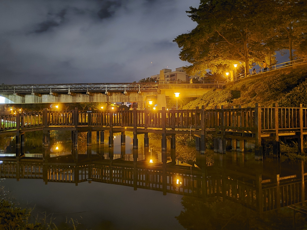 這是離我們家很近的陽明運動公園(桃園),這個水中倒影拍攝點一直是我很喜愛的拍攝地點,現場同樣是一片漆黑,透過夜間模式只需要手持幾秒就能拍攝下來,也不需要腳架。