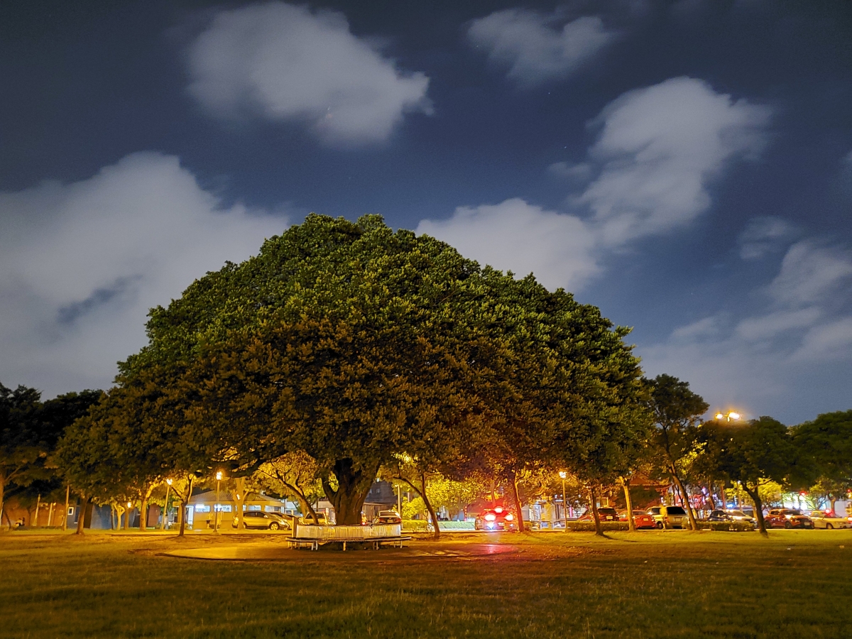 現場的大樹其實是一片黑,透過夜景模式拍的好像有光打在樹上一樣。