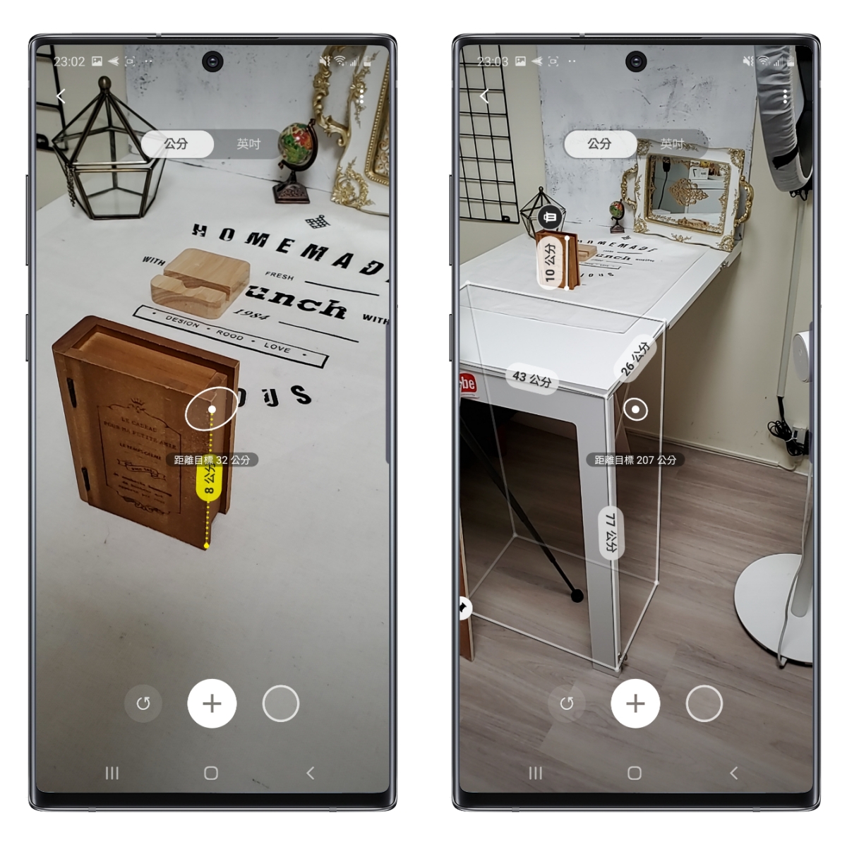 藉由 ToF 鏡頭的景深測距特性,我們也可以使用內建的快速測量 APP 來測量空間或物品大小,不僅可以知道你和目標的距離,也可以自動測量物品的立體大小,或者手動測量單點對單點的距離,而且可以在同一畫面下保留所有你測量的數據,實際使用起來跟用真的量尺比較,頂多誤差值在 1~3 公分左右,可以說是相當的準確。