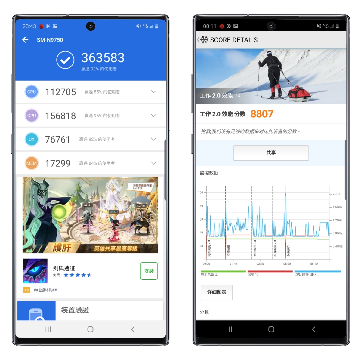 透過安兔兔的測試分數為 363,583,PCMark 工作 2.0 效能分數為 8,807。