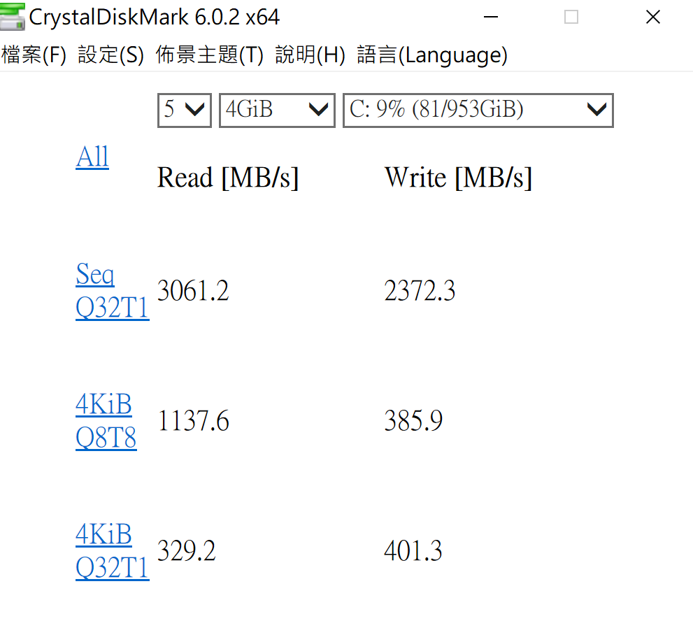 SSD 的部份透過 CrystalDiskMark 測試,讀取測得 3061.2MB/s,寫入測得 2372.3MB/s。