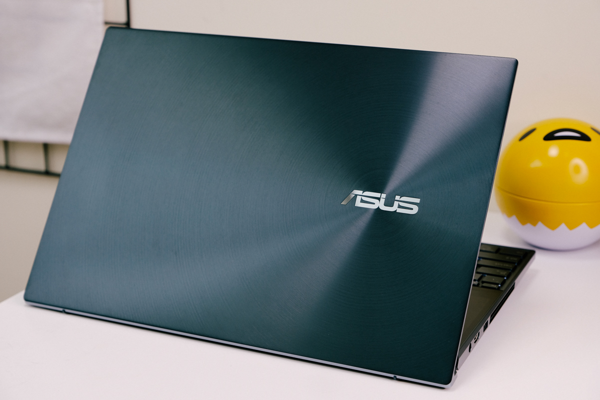 ZenBook Pro Duo 採用蒼宇藍配色,並且在全鋁材質 A 蓋上採用和以往不同的不對稱禪風同心圓髮絲紋設計,同時也將 Logo 放置於靠右側,和對稱式的同心圓設計相較之下,別有另一番感受。