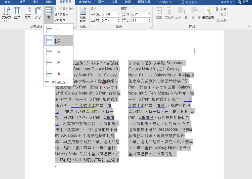 先給大家看一下,這是我們想要呈現的結果,就是選了要變成等高多欄的文字後,在版面配置中選擇欄裡的「二」,就應該要變成這樣,不過大部份人應該會是下一個畫面。
