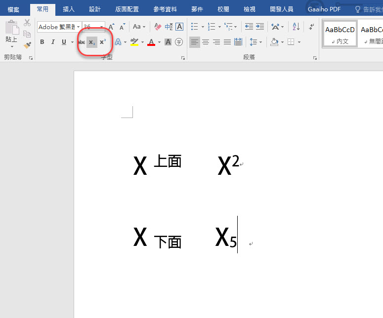 先跟大家分享一般最常用的方法,就是在要輸入上/下標的地方,點擊上方常用裡的功能鍵,就可以輸入,輸入完後再按一下就會回到正常的輸入位置。