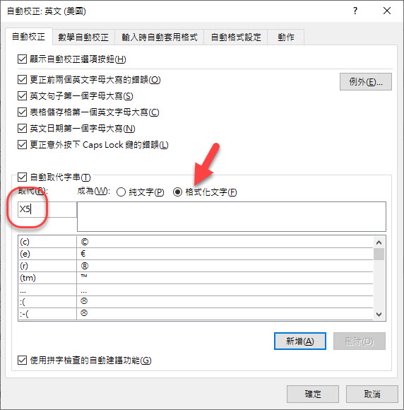 然後在自動取代字串那先選擇格式化文字後,在左邊取代那欄輸入 X5。