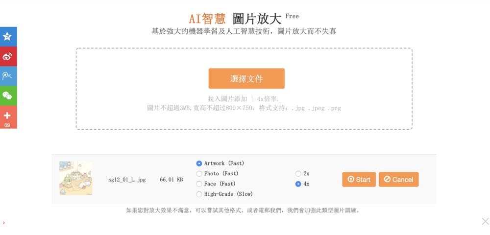 1) 先下載 《AI 圖片無損放大》(連結) 2) 選擇想要變清楚的圖片(檔案不能超過 3MB,尺寸不要超過 800×750 )