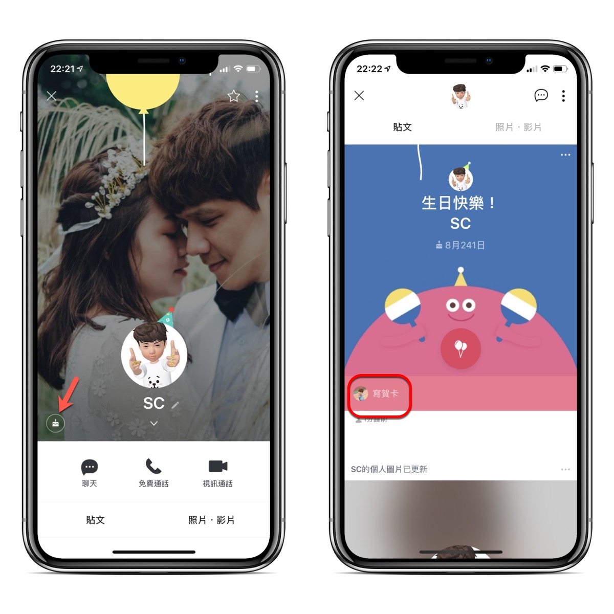 如果你已經更新到最新版本(Android 或 iOS 都有此功能),想要使用生日賀卡的話,可以點擊對方的個人檔案後,如果是當天或明天生日的話,在他個人檔案左下角會看到一個蛋糕圖示,點擊後就可以寫賀卡了。