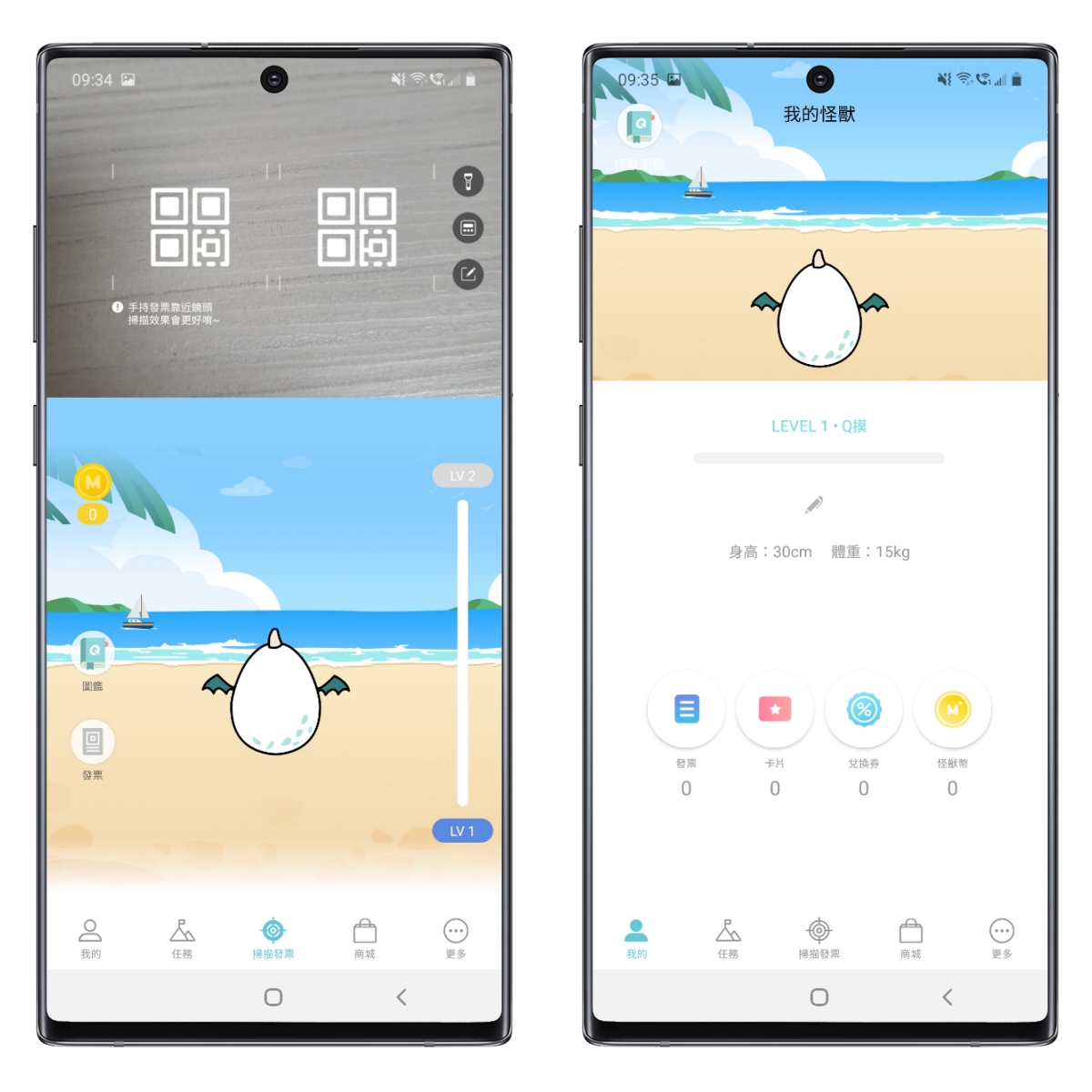 第一次使用,進入時會看到你的怪器是一顆小蛋,只有一對小翅膀跟一個小尖角,掃瞄發票的介面可以看到等級外,最有趣的是在個人資料頁看到自己的怪獸資料,居然還有身高跟體重耶,一般的電子寵物都只會看到圖案的大小變化,我們就先往下來掃瞄發票試試會發生什麼事吧。