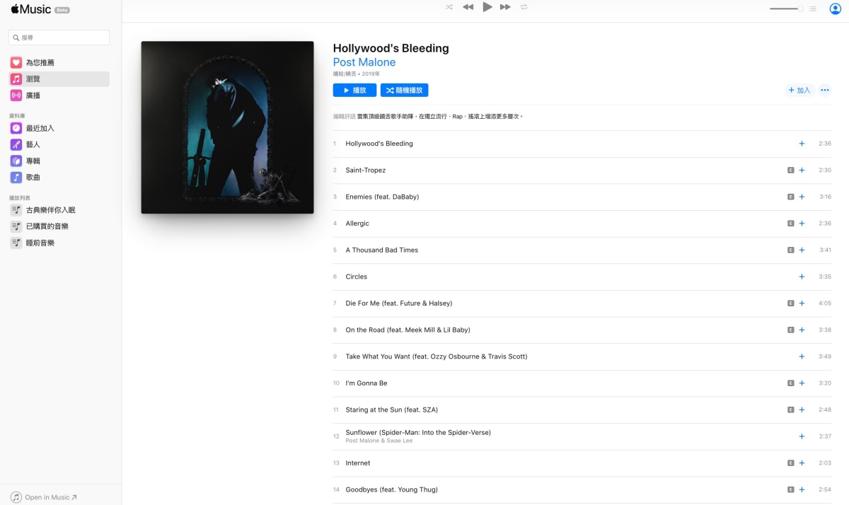 在歌單的右上角選單裡,也有選擇稍後播放等操作,簡單的來說,目前網頁版該用上的功能大致上都有了,不用安裝 iTunes 就是方便很多,因為我覺得 iTunes 改了那麼多版還是很難用,不知道啥時才可以變好用。