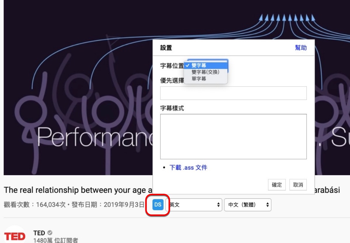 另外如果想要調整字幕相關設定,可以點擊藍色的 DS 圖示,就可以選擇,不過我覺得不太需要調整什麼啦。